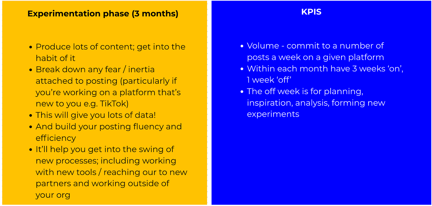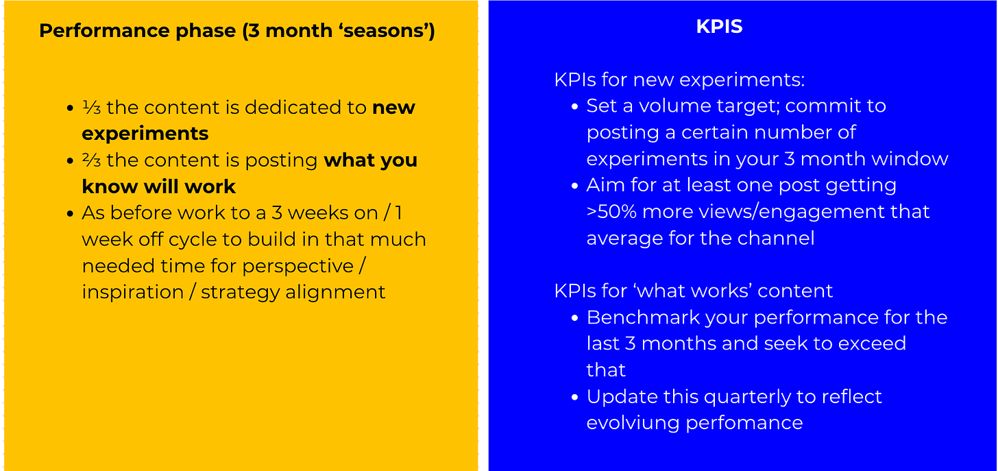 We need KPIs that are flexible to this dual function of creating content (experimentation and performance).