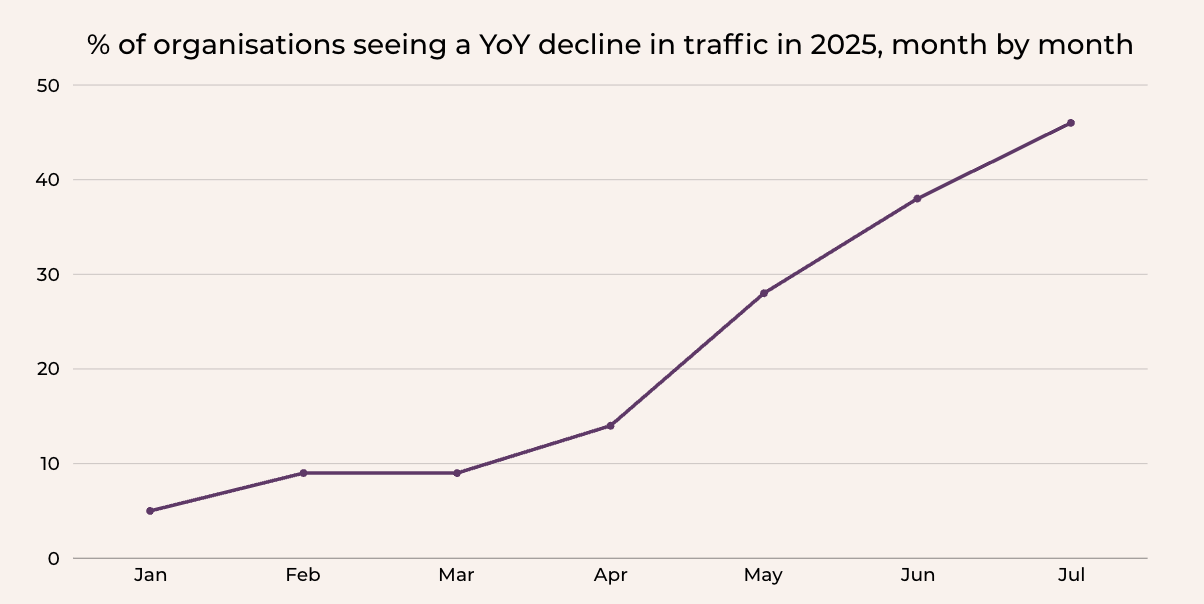 In 2025, 80% of organisations are receiving less traffic from Google than they did in 2024. A further 13% have increased their search traffic, but at a slower rate than in 2024.