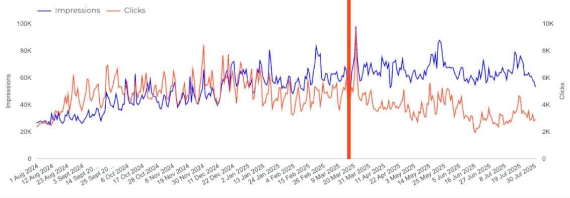 Impressions continue to rise – people are still seeing your content mentioned in search results – but clicks are falling because they're getting their answers directly from AI Overviews without needing to visit your site. The gap between visibility and actual traffic keeps widening.